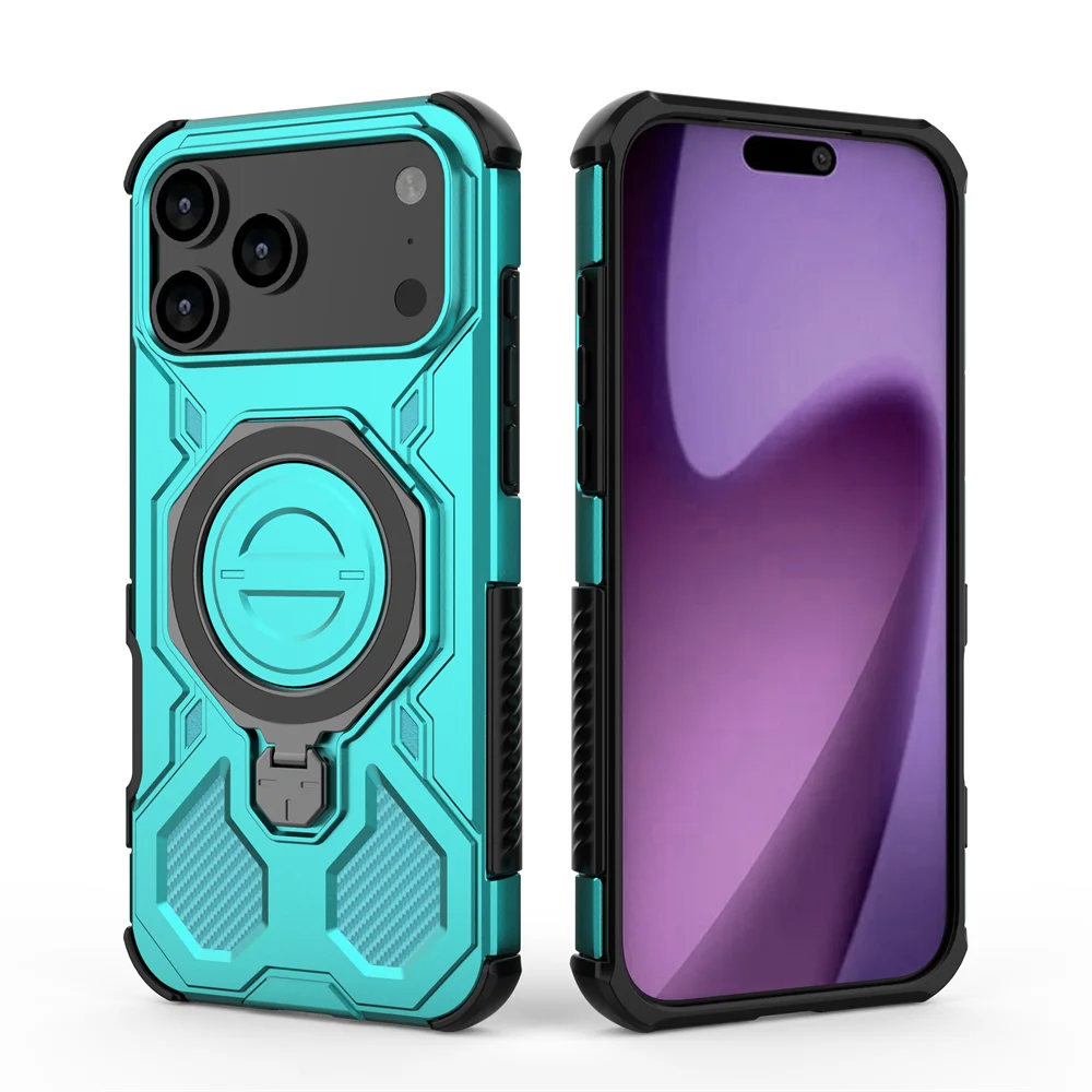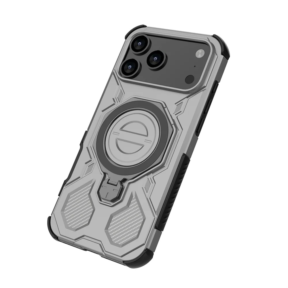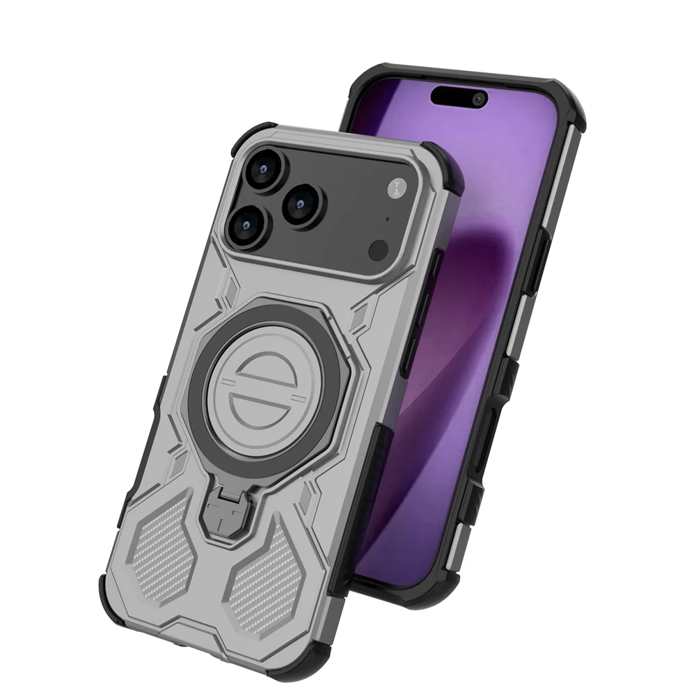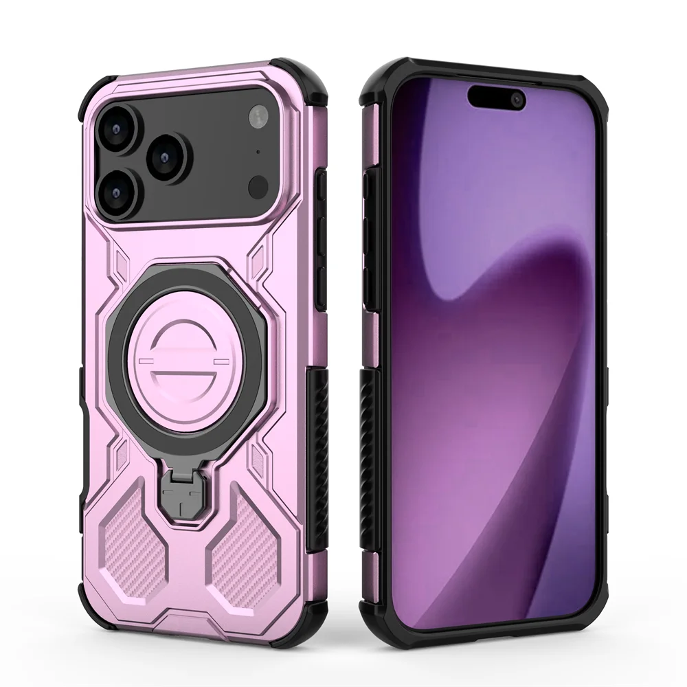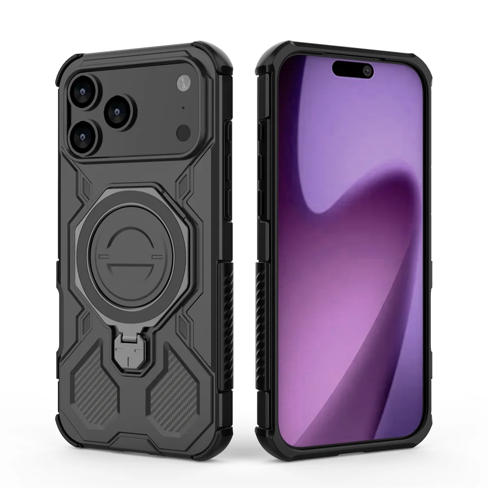 Upgrade your iPhone 17 Series protection with this armor-style ring stand case. Designed with a rugged dual-layer build, it offers strong drop resistance and full coverage. The 360° rotating metal ring works as a stand and magnetic mount holder, making it both protective and functional.