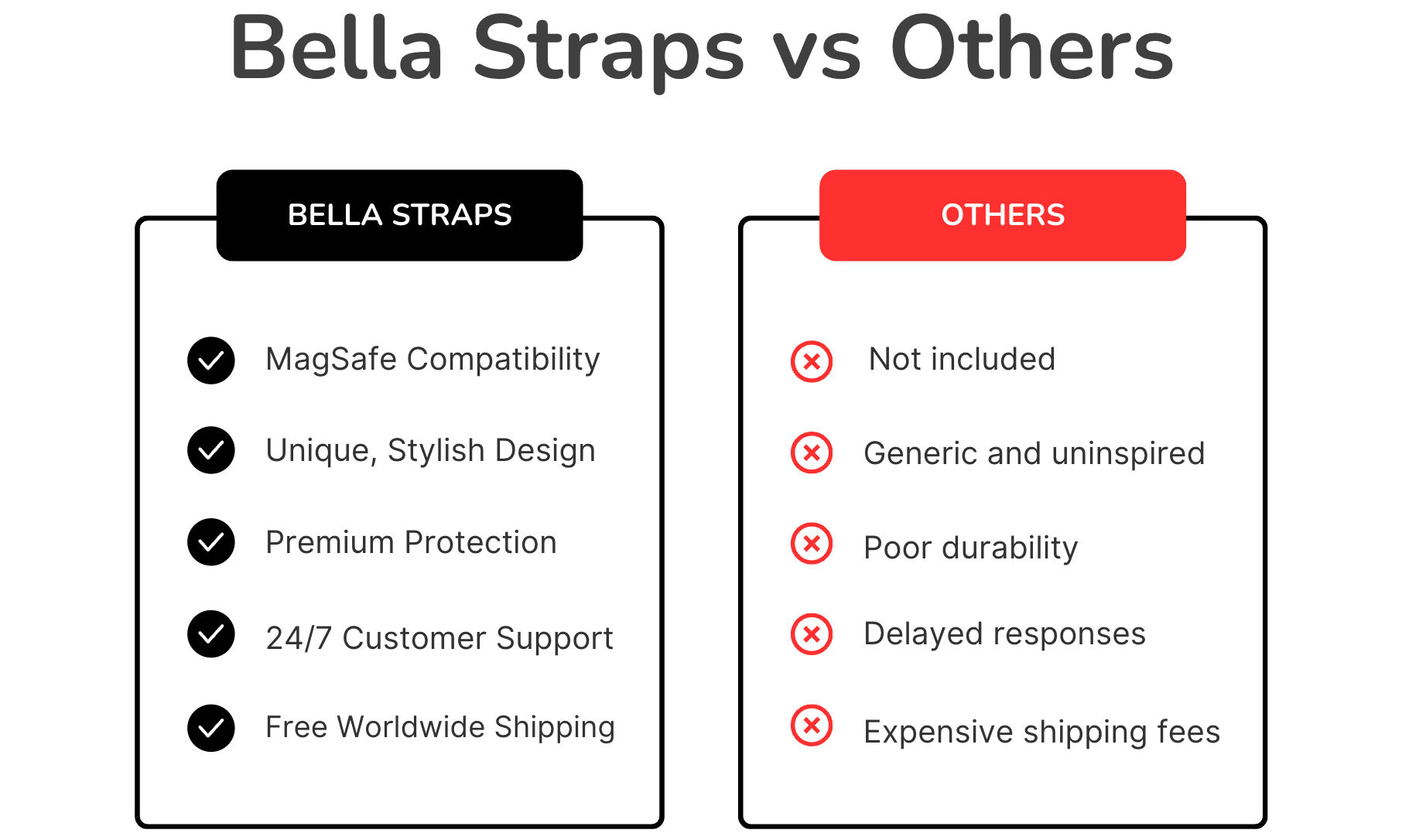 Our comparison table shows what sets us apart—MagSafe compatibility, premium protection, free worldwide shipping, and 24/7 support. We prioritize your convenience and style, delivering the best phone case experience!